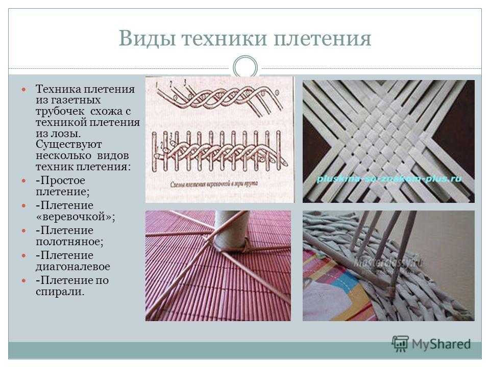 Виды техники плетения Техника плетения из газетных трубочек схожа с техникой плетения из лозы. Существуют несколько видов техник плетения: -Простое плетение; -Плетение «веревочкой»; -Плетение полотняное; -Плетение диагоналевое -Плетение по спирали.
