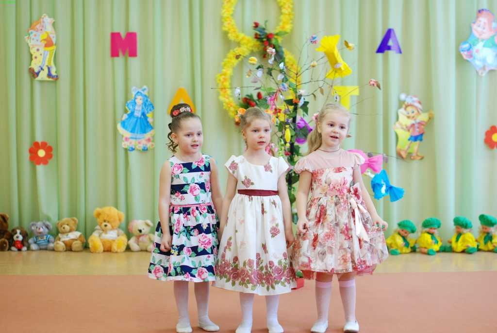 Первый вариант сценки — «Три мамы». В ней рассказывается о том, как проходят домашние будни всех трёх поколений женщин в семье. Здесь описываются заботы мамы о своих детках, а также бабушка, которая переживает не только о своих маленьких внучатах, но и о детях, уже выросших. Особенно мило эта сценка выглядит в исполнении совсем маленьких детей. Герои представления переодеваются в одежду своих родных женщин, а затем обыгрывают их поведение и переживания.