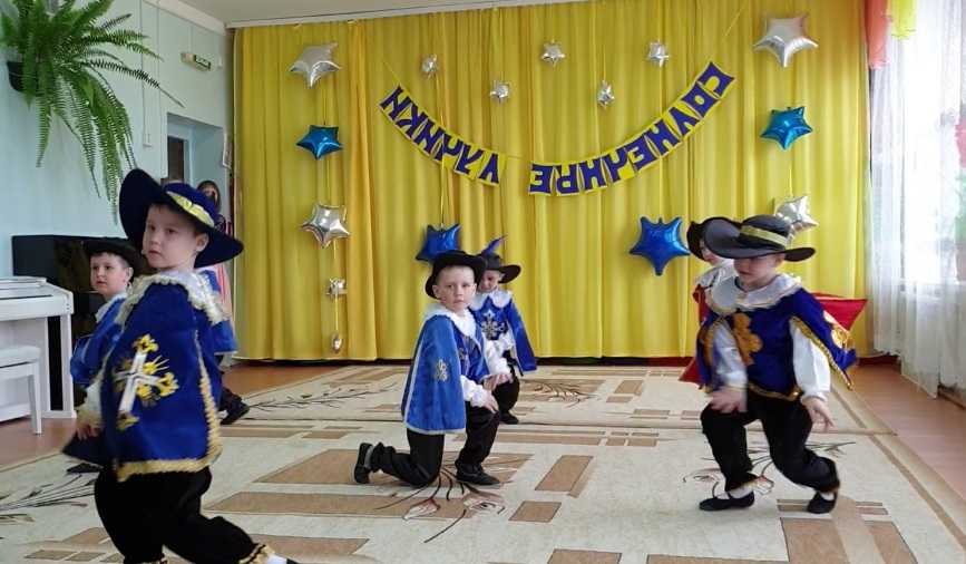 Приведем один из примеров постановки музыкальной сценки. Она называется «Поздравляют мушкетёры».Громко звучит музыка: «Пора-пора-порадуемся…»Выходят мушкетеры, одетые в соответствующие костюмы.