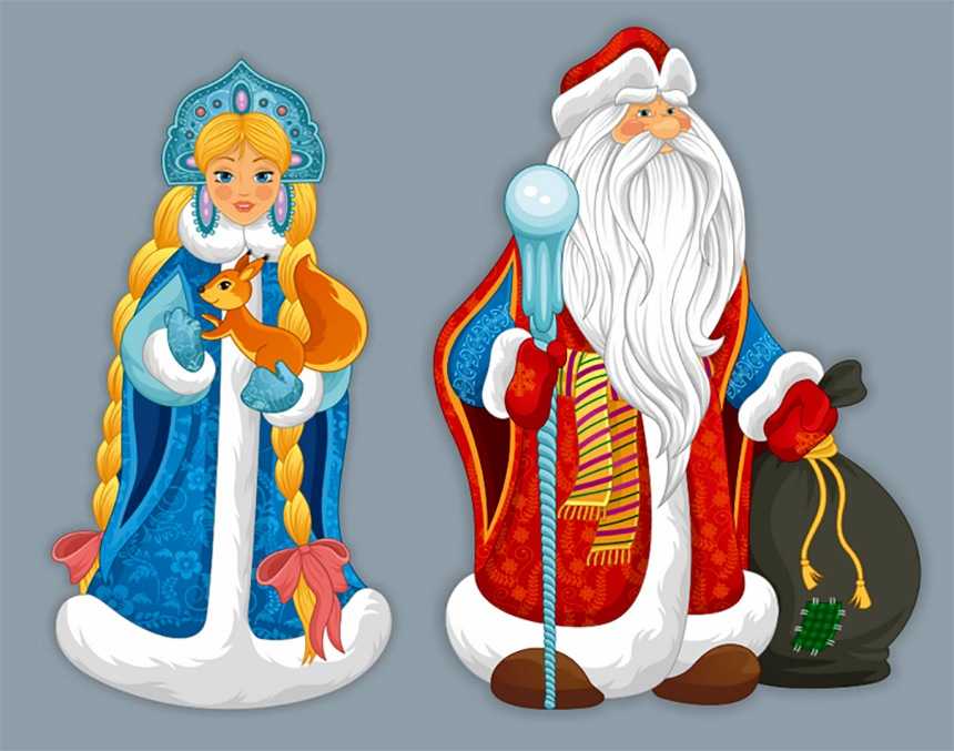 - Дед Мороз. Одет в длинную синего цвета шубу с опушкой. На ногах высокие сапоги. На голове шапка из такой же ткани и с такой же опушкой, как на шубе. Парик с белыми волосами, длинная белая густая борода. Красный (нарисованный) нос. На руках варежки красного цвета с опушкой. Мешок с подарками. Волшебный посох.
