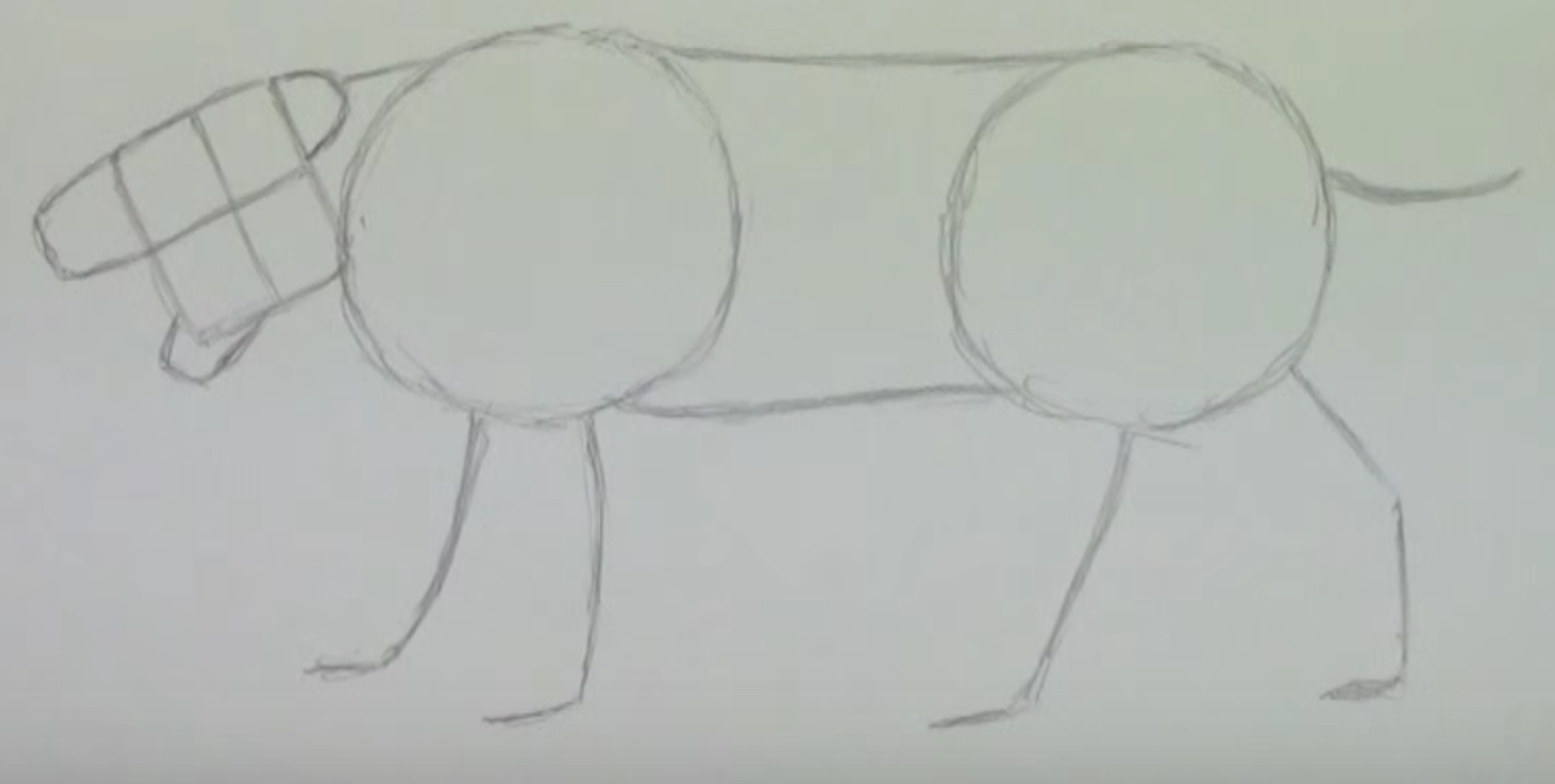Плавными дугами соединяем окружности, обозначая контур туловища, по бокам, в верхней части квадрата-головы рисуем дуги, к нижней левой четверти тоже пририсовываем дугу по диагонали. Намечаем лапы и недлинный хвост.