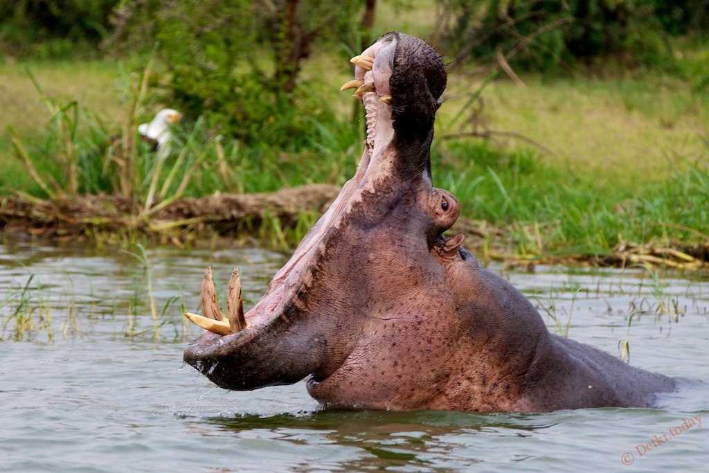 Распахнутая пасть гиппопотама на фото впечатляет. Еще бы, ведь длина его челюсти может быть 70 см и даже больше. В природе животное раскрывает пасть, чтобы прогнать других особей со свой территории. В зоопарке бегемоты проделываю подобный трюк, когда хотят, чтобы дети угостили их чем-то вкусненьким.