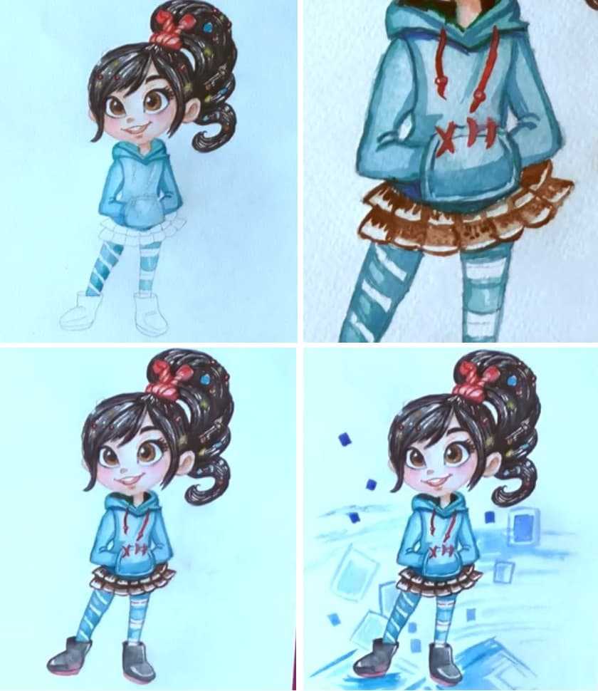 4. Используем смесь охры и немного красно-розовой краски, наносим краску на рисунок. Пока не высохла поверхность, наносим розовые пятна там, где щечки и темным охристо-розовым рисуем тени. По бумаге краска должна растекаться мягко, не оставляя пятен и потеков. Светло-синим наносим краску на глаза, чёрным нарисуем ресницы. Радужки будут коричневые, зрачки черные, блики оставляем белыми. Закрасим волосы в черный цвет, оставляем маленькие детали – конфетки. Закрасьте детали прически — разноцветные конфетки и банд в красный цвет.