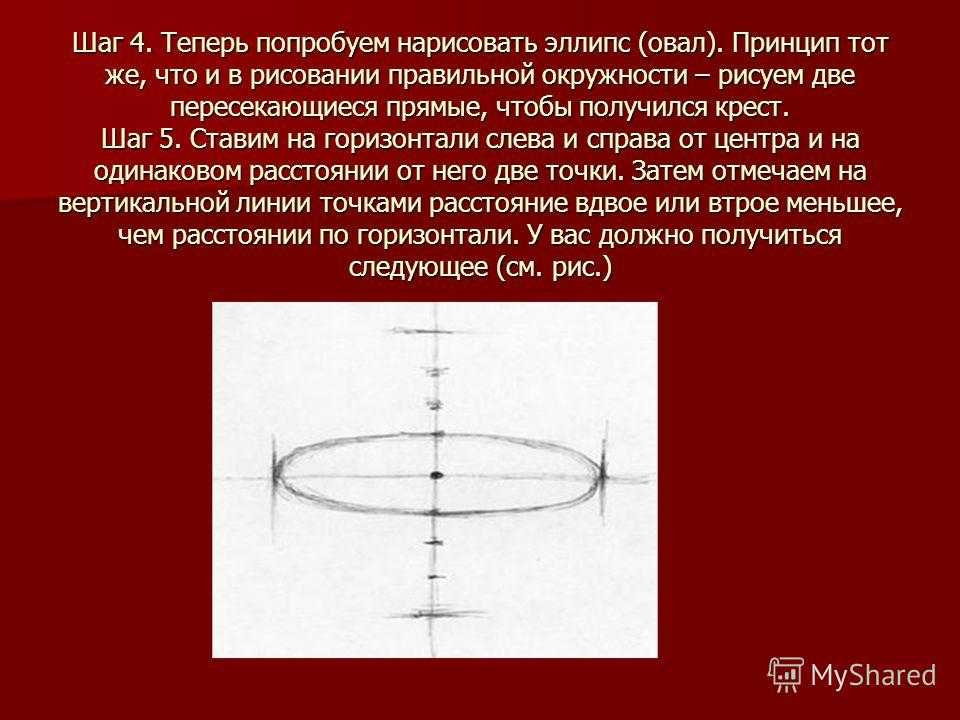 Шаг 4. Теперь попробуем нарисовать эллипс (овал). Принцип тот же, что и в рисовании правильной окружности – рисуем две пересекающиеся прямые, чтобы получился крест. Шаг 5. Ставим на горизонтали слева и справа от центра и на одинаковом расстоянии от него две точки. Затем отмечаем на вертикальной линии точками расстояние вдвое или втрое меньшее, чем расстоянии по горизонтали. У вас должно получиться следующее (см. рис.)