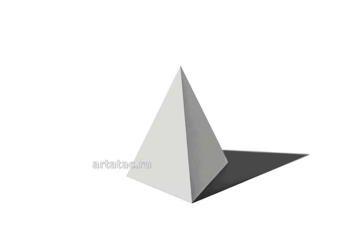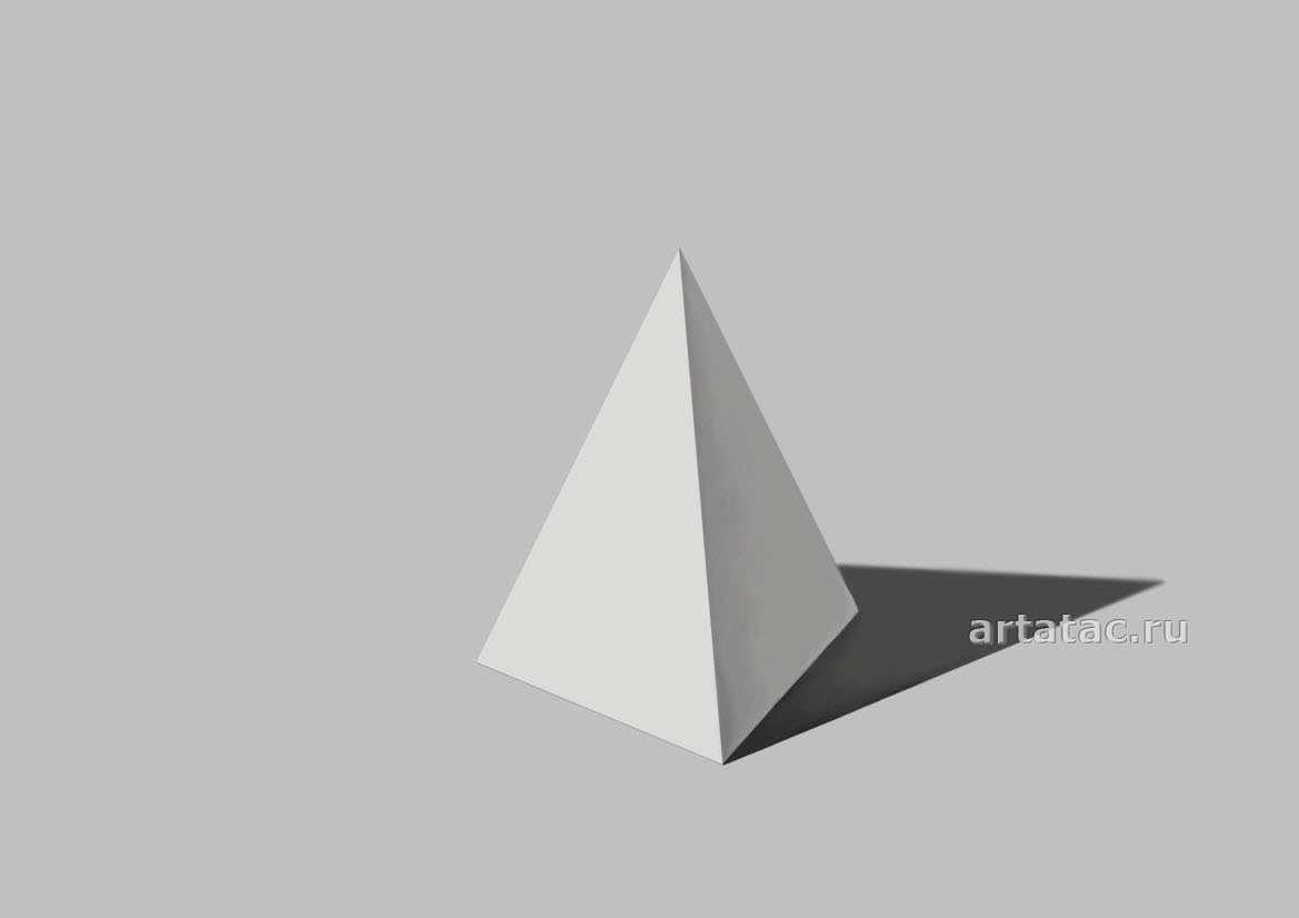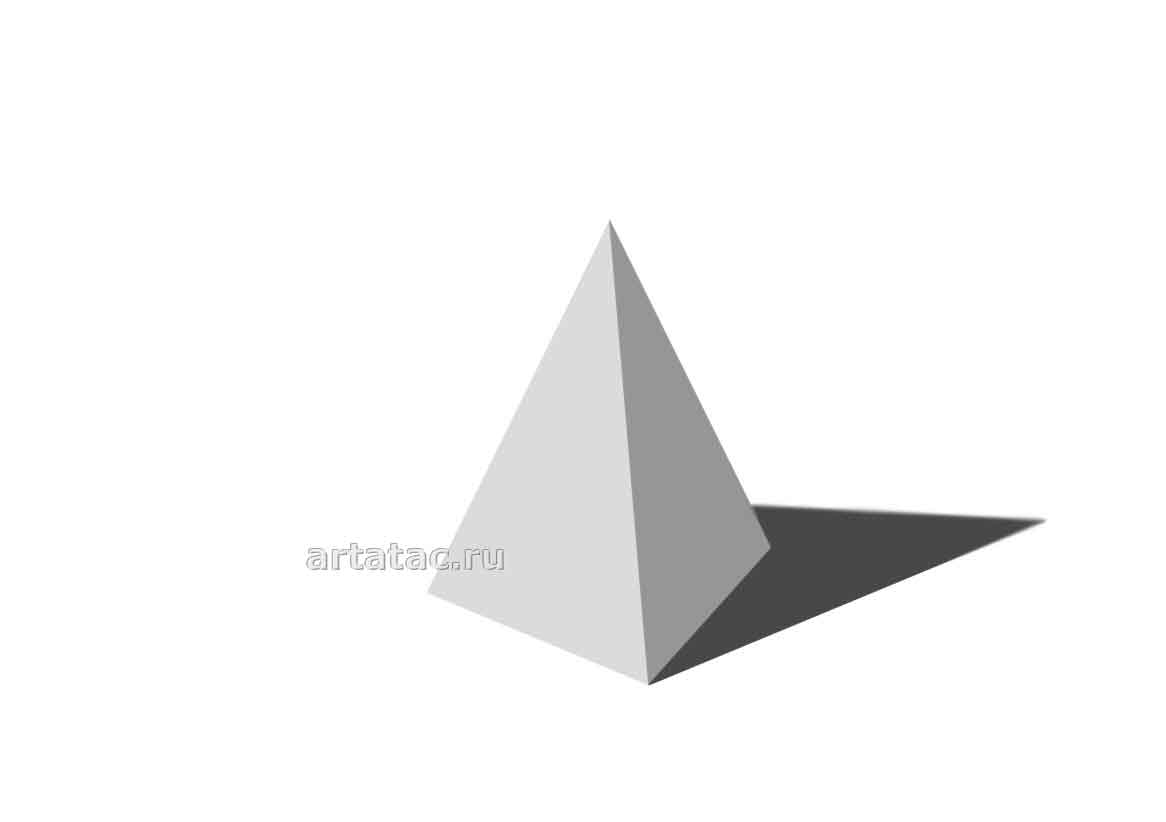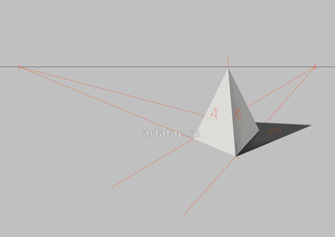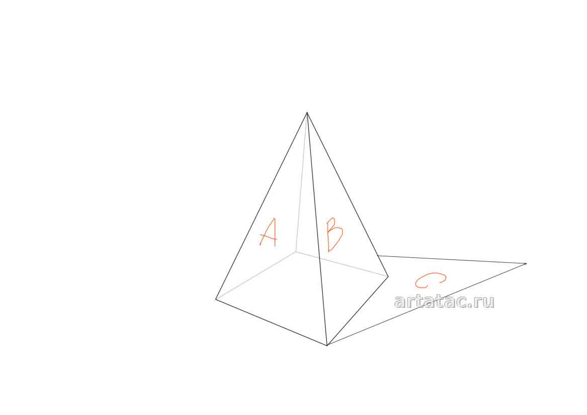 У нас три основных плоскости A — передняя часть пирамиды (свет). B — боковая часть, находящаяся в тени (собственная тень пирамиды). C — (падающая тень). Смотрим вниз: