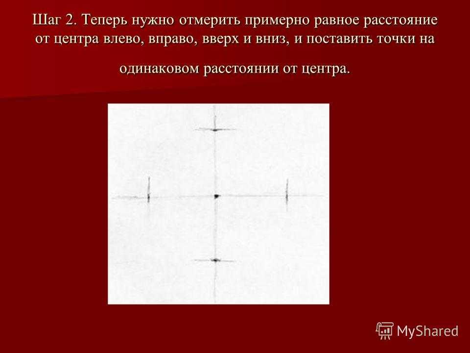 Шаг 2. Теперь нужно отмерить примерно равное расстояние от центра влево, вправо, вверх и вниз, и поставить точки на одинаковом расстоянии от центра.