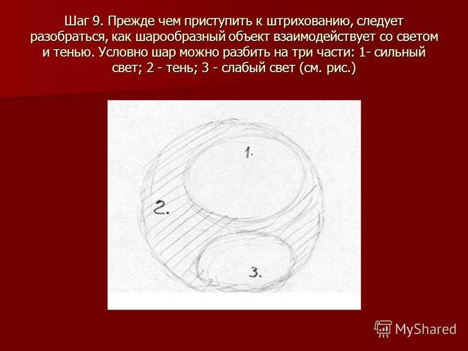 Шаг 9. Прежде чем приступить к штрихованию, следует разобраться, как шарообразный объект взаимодействует со светом и тенью. Условно шар можно разбить на три части: 1- сильный свет; 2 — тень; 3 — слабый свет (см. рис.)