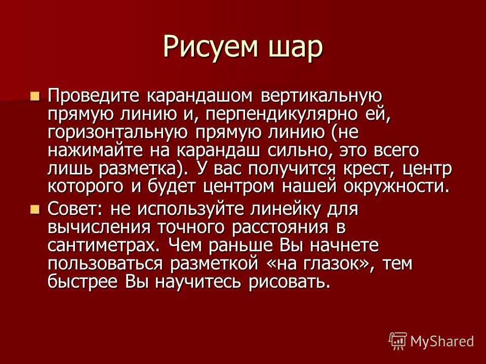 Рисуем шар Проведите карандашом вертикальную прямую линию и, перпендикулярно ей, горизонтальную прямую линию (не нажимайте на карандаш сильно, это всего лишь разметка). У вас получится крест, центр которого и будет центром нашей окружности. Проведите карандашом вертикальную прямую линию и, перпендикулярно ей, горизонтальную прямую линию (не нажимайте на карандаш сильно, это всего лишь разметка). У вас получится крест, центр которого и будет центром нашей окружности. Совет: не используйте линейку для вычисления точного расстояния в сантиметрах. Чем раньше Вы начнете пользоваться разметкой «на глазок», тем быстрее Вы научитесь рисовать. Совет: не используйте линейку для вычисления точного расстояния в сантиметрах. Чем раньше Вы начнете пользоваться разметкой «на глазок», тем быстрее Вы научитесь рисовать.