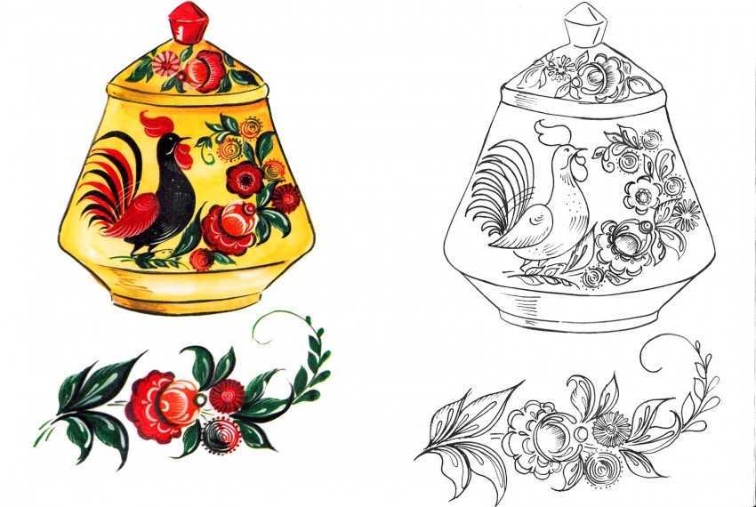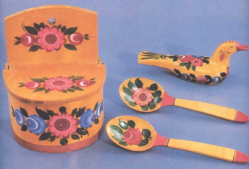 - Красочная живопись быстро стала популярной, благодаря чему ею начали украшать не только донца прялок, но и другую утварь и даже отдельные элементы кораблей. В итоге начали появляться чашки, ложки, плошки и прочая мелочевка, расписанная незамысловатыми рисунками в красных, желтых, синих, зеленых и коричневых оттенках.