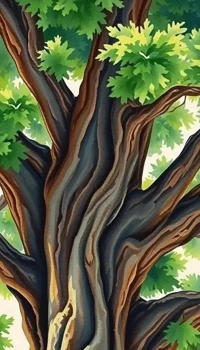 Дуб – могучее дерево с толстым стволом и крепкими ветвями. Его кора имеет грубую текстуру, которую можно передать с помощью техники «сухой кисти». Листва дуба густая и плотная, поэтому используйте насыщенные оттенки зеленого и коричневого, рисуя крупными мазками.