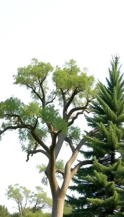 Береза: Элегантность и изящество. Характеризуется стройным, часто изогнутым стволом. Кора березы — ее визитная карточка: белая, гладкая, с черными горизонтальными полосками и пятнами. Крона легкая, ажурная, с тонкими, поникающими ветвями. Листва мелкая, сердцевидная, создающая ощущение воздушности и прозрачности. Передача контраста между белой корой и темными пятнами, а также легкости листвы — ключ к реалистичному изображению березы.