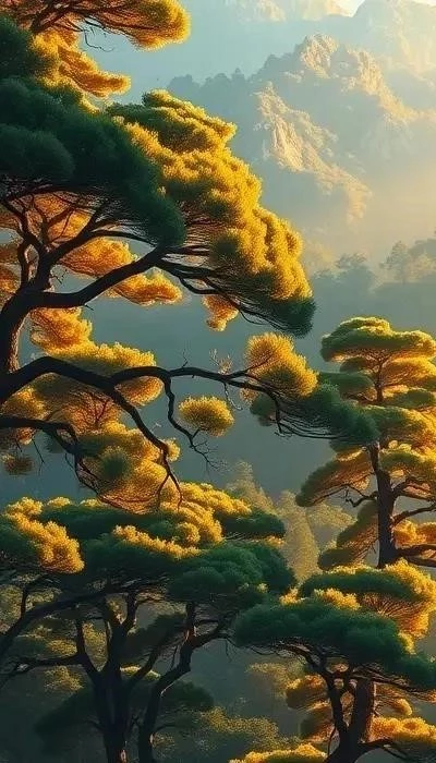 Сосна: Могучая и живописная. В отличие от ели, крона сосны часто более раскидистая, неправильной формы, расположенная высоко на стволе. Ствол может быть изогнутым, с красноватой, чешуйчатой корой. Хвоя длинная, собрана в пучки. При изображении сосны акцент делается на мощном стволе, характерных изгибах веток и разреженной, но объемной кроне. Важно передать ее характерную «пушистость» и игру света на длинных иголках.