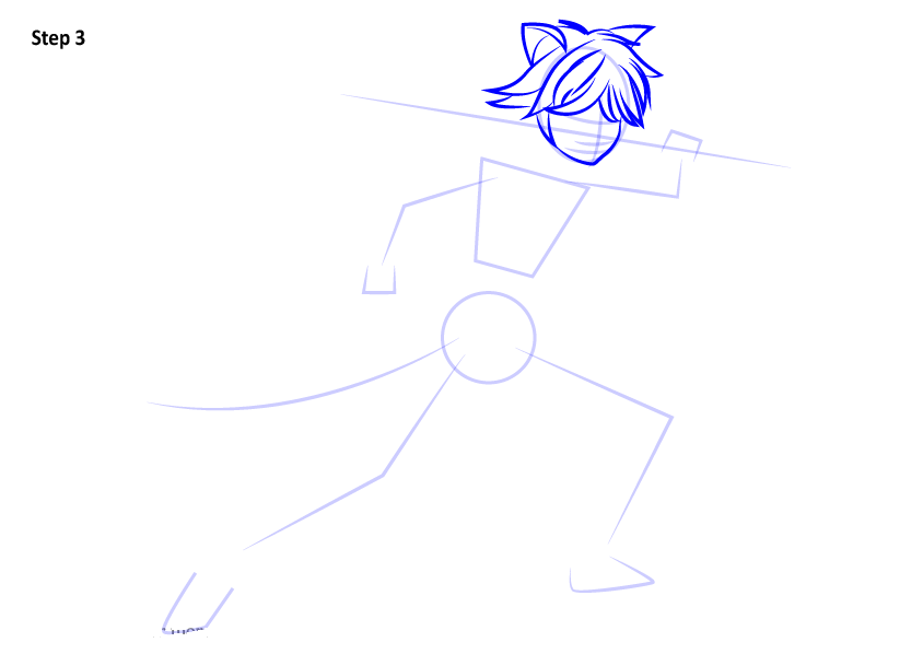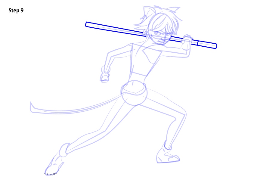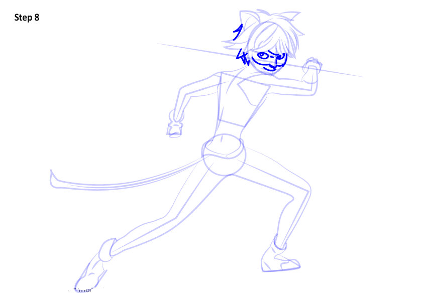 Линиями наметьте руки и ноги Супер-Кота, сделайте углы там, где будут локтевые и коленные суставы. Не забудьте, что у Супер-Кота еще есть хвост, набросайте и его каркас. - Прорисуйте прическу, уши, маску и черты лица героя.
