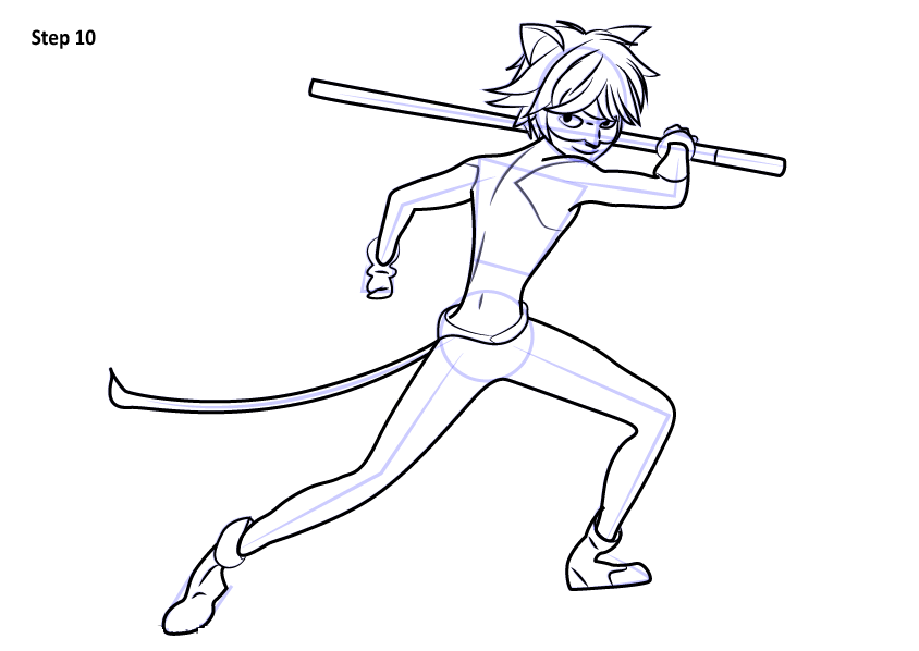 - Придайте объема его рукам и ногам. Обут наш герой в ботинки, протекторы на подошве которых, кстати, имитируют кошачью лапу. На его талии Супер-Кота есть пояс, продолжением которого и является хвост. Руки с острыми коготками (хотите, изобразите и их на рисунке) одеты в перчатки. А на запястьях парня нужно нарисовать напульсники.