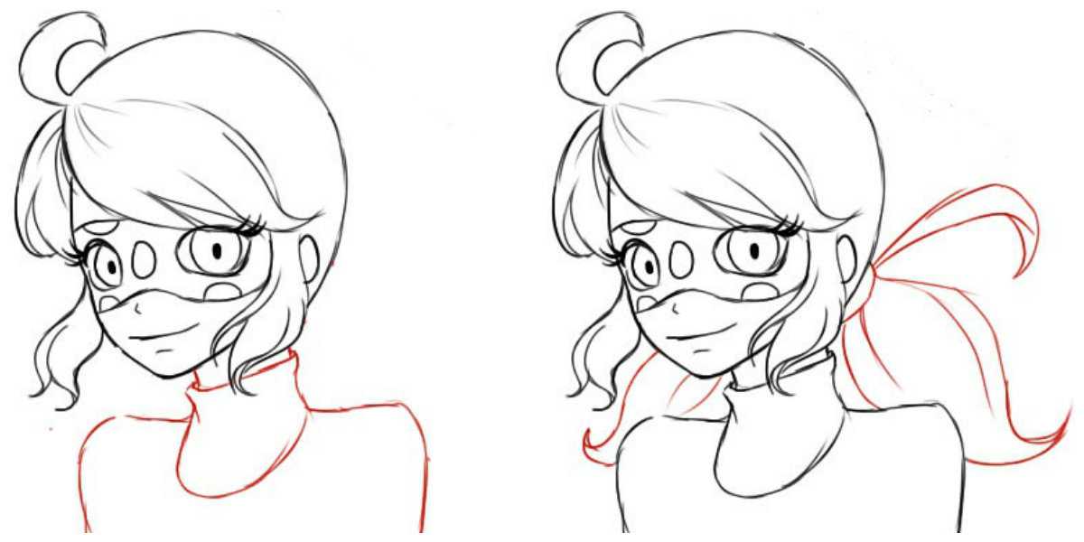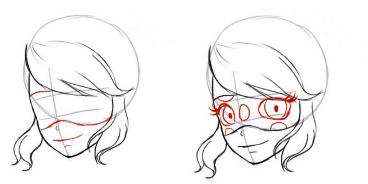 - Теперь разметьте и прорисуйте прическу, маску и черты лица Леди Баг так, как обозначено в инструкции выше в статье.