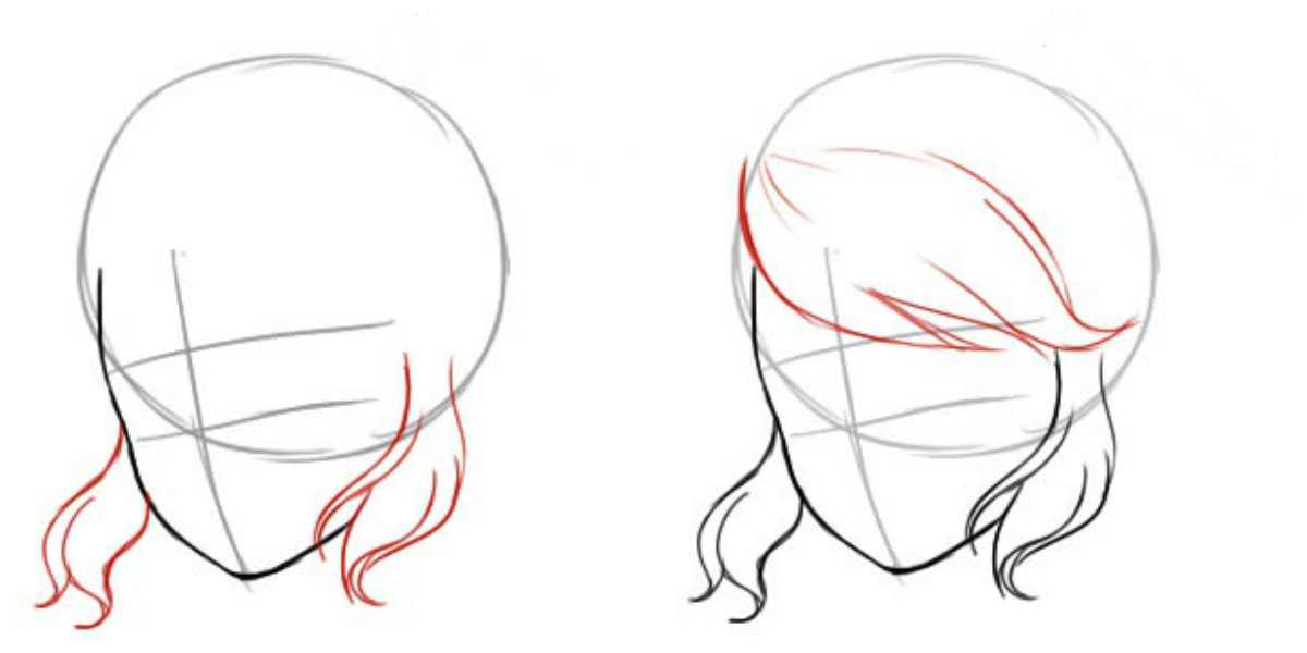 - У Леди Баг прическа – два хвостика и челка. Прорисуйте ее. Не делайте челку сплошной, разделите ее на отдельные пряди, тогда волосы не будут выглядеть слишком искусственно.