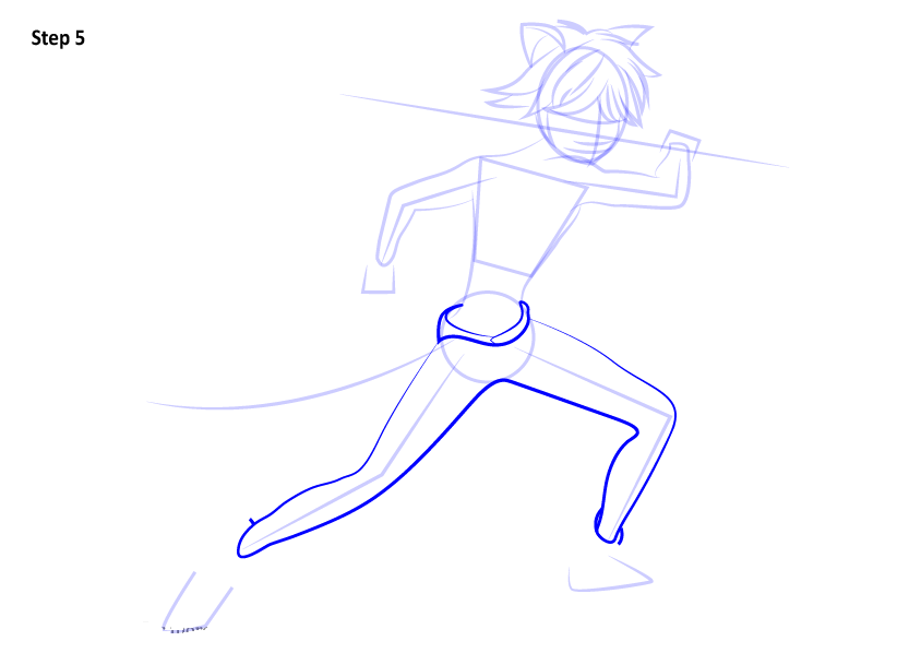 Дорисовываем тело, а точнее согнутые ноги. Правую руку не дорисовываем т. к. там будет хвост героини. Полностью дорисуйте волосы, собранные в хвост.