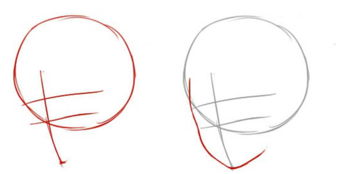 Сделайте подбородок более острым. Рядом с вспомогательной линией сделайте более узкое место. А с противоположной стороны изобразите прядь волос.