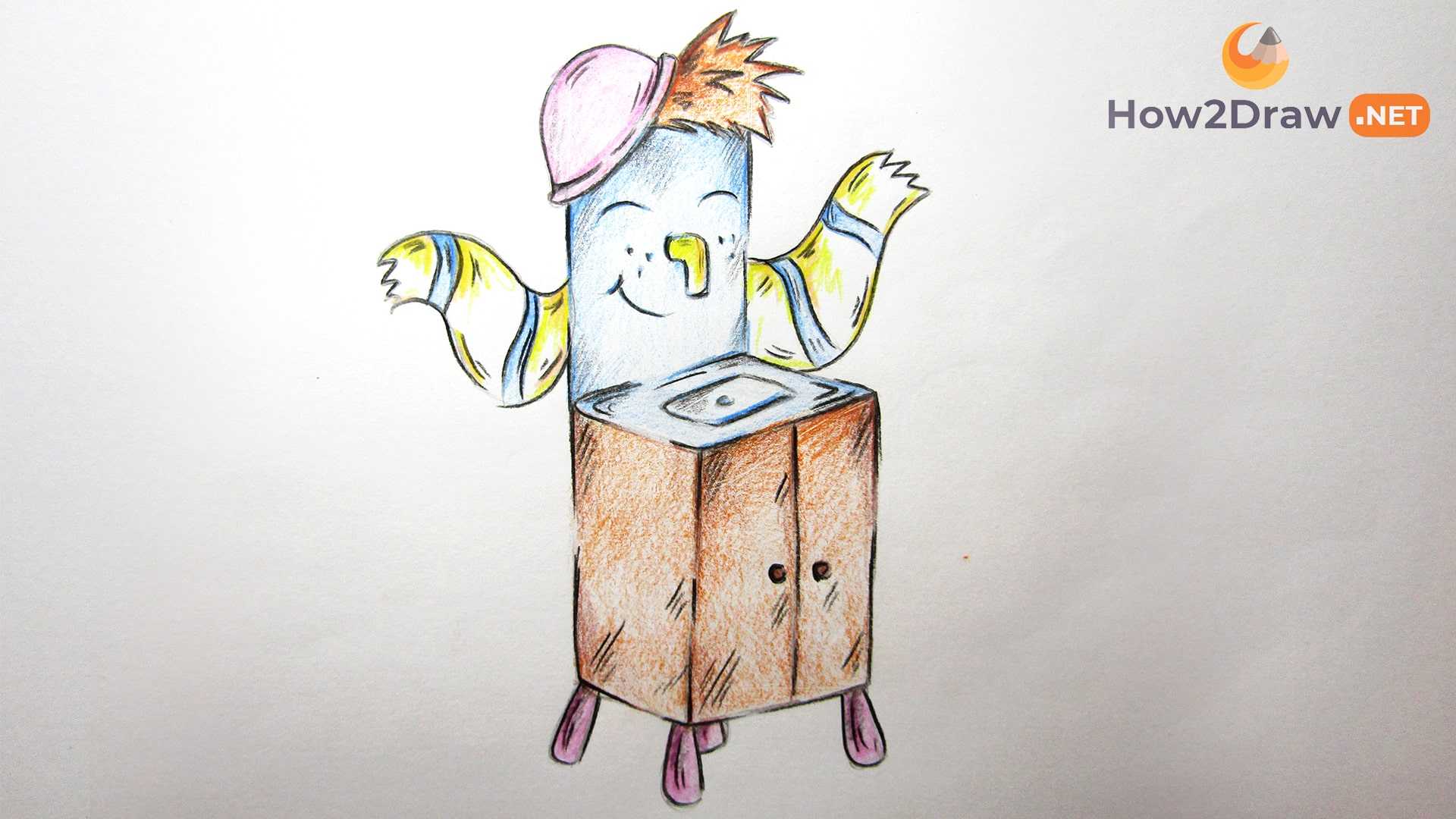 - Внутри тумбы изобразите прямоугольник – углубление раковины, улыбку.