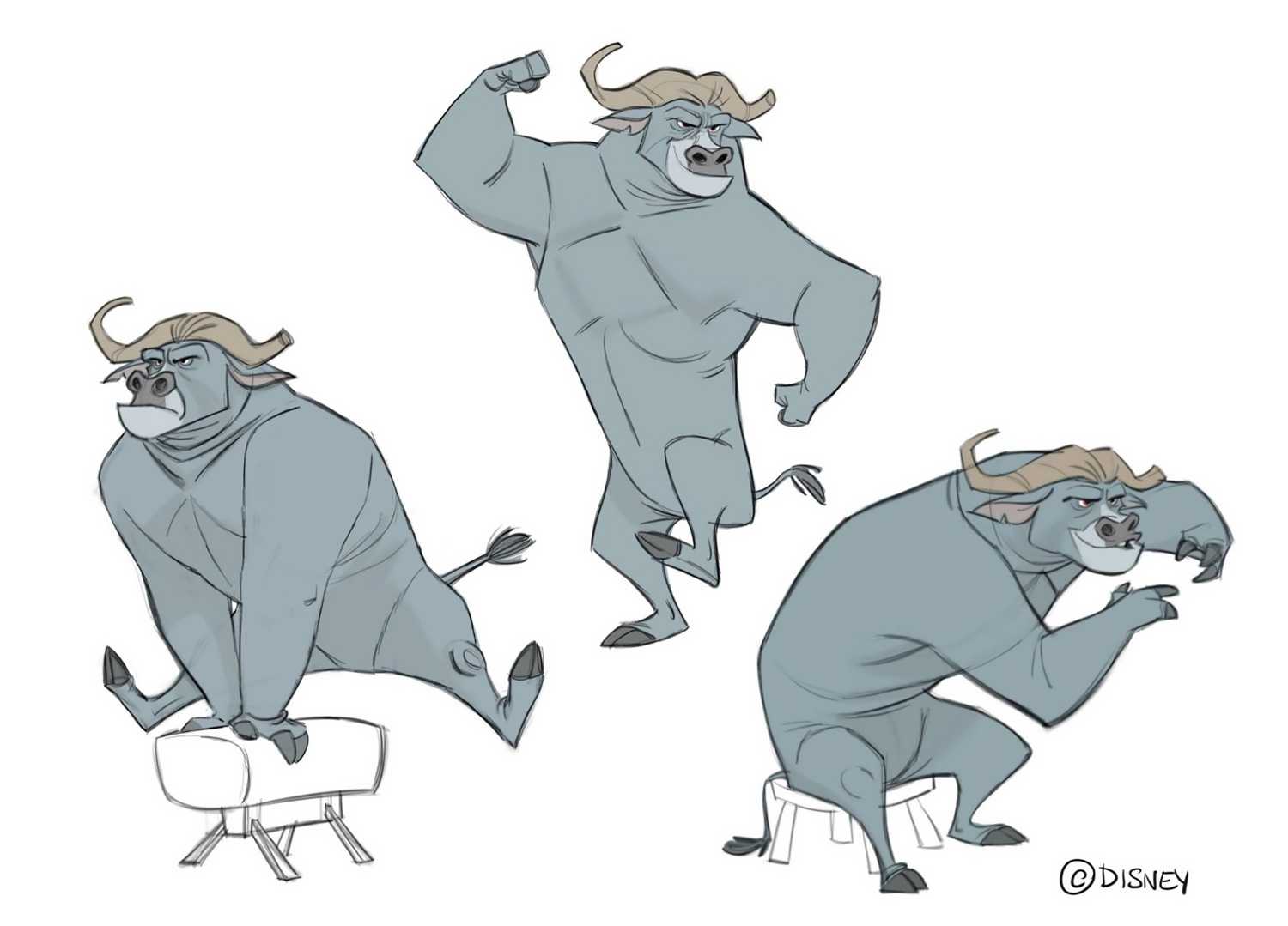 Изображение мультяшного быка из «Зверополиса» в разных позах (стоит, сидит, прыгает)