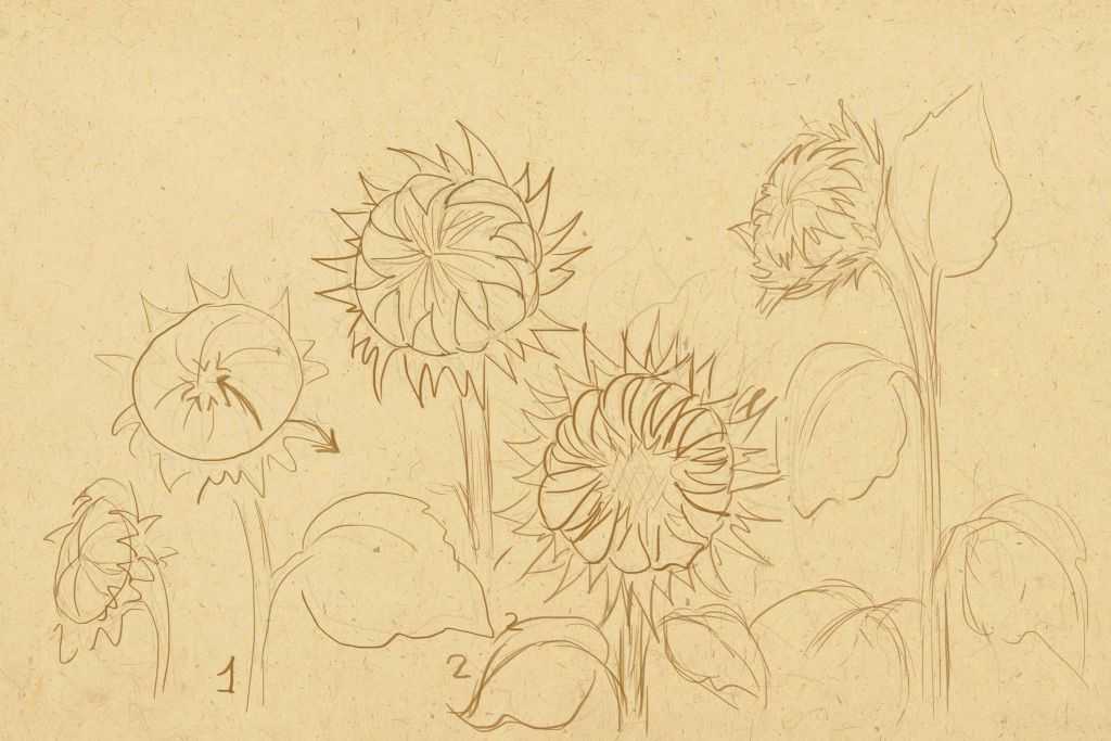 Перед тем как приступить изображению нашего солнечного цветка — найдите хороший пример. Лучше всего если вы используете как пример живой подсолнух, хорошенько его рассмотрите, покрутите и подержите в руках, а потом оставите свое впечатление на листе бумаги. Если сейчас не сезон, в качестве натуры стоит подобрать фотографии солнечных растений в разных ракурсах и на разной стадии цветения.