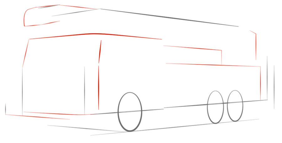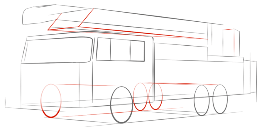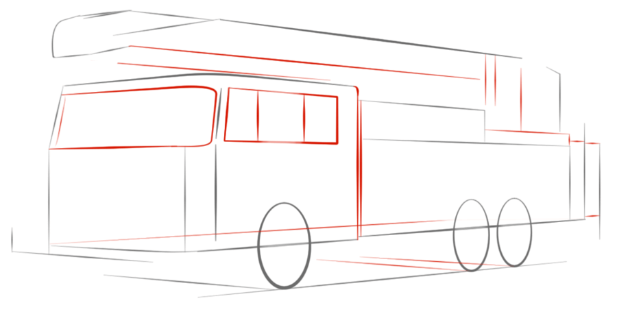 Верх мы нарисовали практически, нам нужно прорисовать колеса пожарки. Более детально очерчиваем кузов и окна.