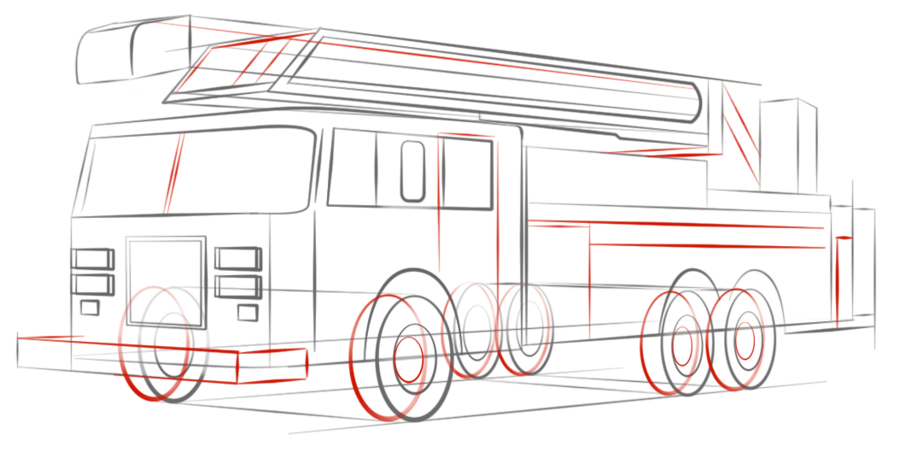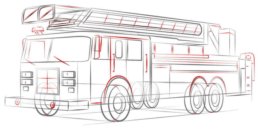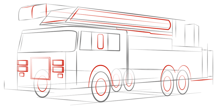 Теперь нам нужно уделить внимание характерным деталям. В частности прорисуем сложенную сверху лестницу пожарной машины