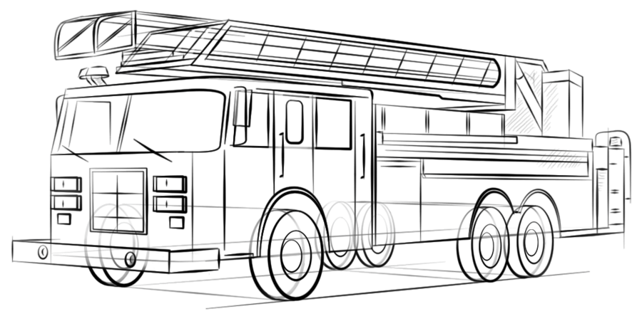 Прорабатываем более мелкие детали кабины: бампер, решетку радиатора, щетки, зеркала заднего обзора и ручки на дверях. Добавляем толщину колес, перекладины лестницы и подъемный механизм. Чем больше мелочей на рисунке соответствуют действительности, тем больше он похож на настоящую машину.