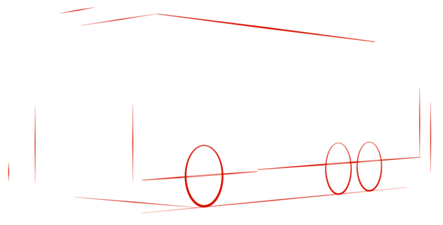 Форма автомобиля похожа на прямоугольник. Поэтому подготовим основной набросок именно такой. Сразу нарисуем три видимых левых колеса: одно под кабиной и два под кузовом.
