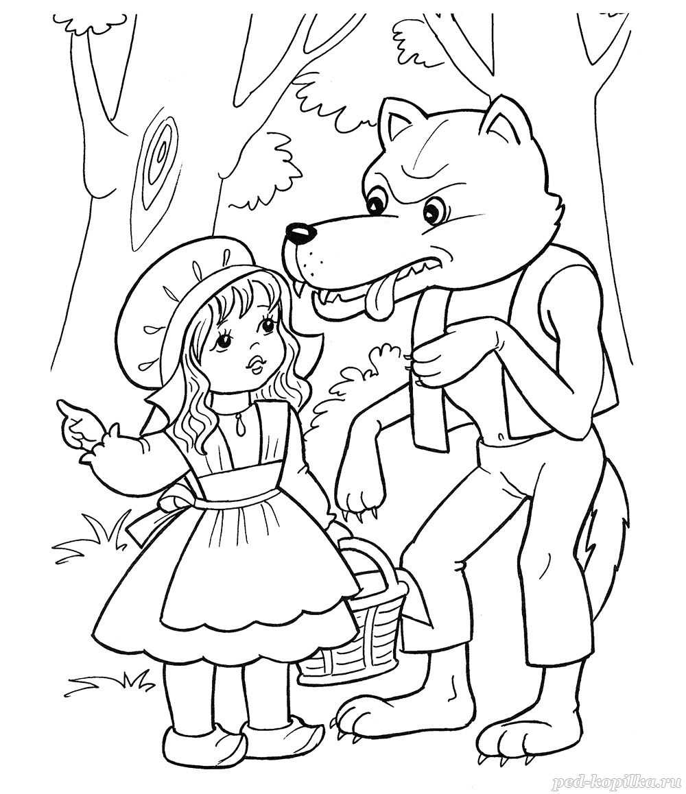 Очень захотелось ему съесть девочку, он не посмел: где-то близко стучали топорами дровосеки. Облизнулся Волк и спрашивает Красную Шапочку: