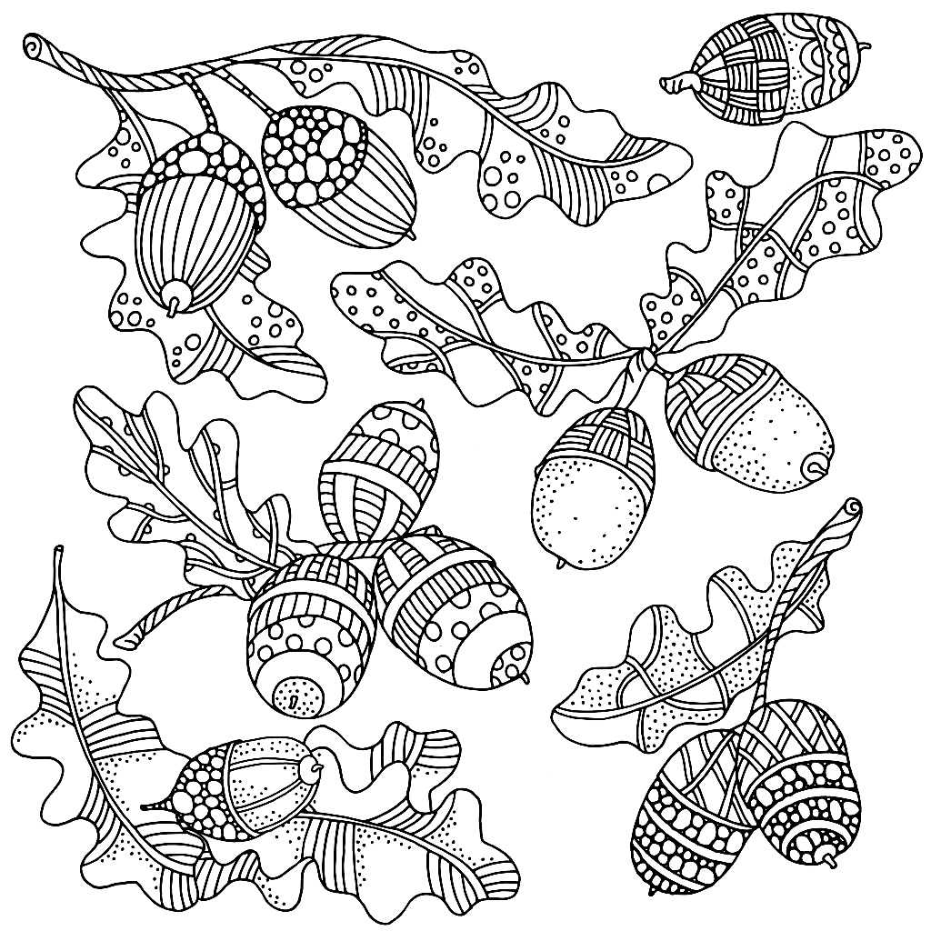 Раскраска с осенними листьями, желудями, орехами и грибами