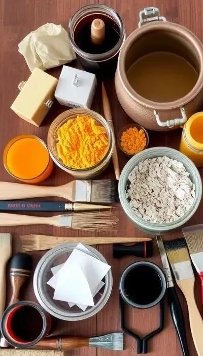 Для нанесения воска потребуются специальные инструменты: восковые карандаши, кисти с жесткой щетиной или электронагреватель с насадками. Кисти для красок выбирайте в зависимости от желаемого эффекта – от тонких для прорисовки деталей до широких для заливки фона. Также понадобятся: емкости для воска и красок, палитра, тряпки для удаления излишков, фен для ускорения сушки, наждачная бумага для подготовки поверхности и финишный лак для защиты рисунка.