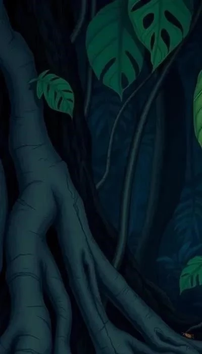 Освещение в ночном тропическом лесу – это игра теней и редких лучей лунного света, пробивающихся сквозь плотный полог деревьев. Биолюминесценция грибов и некоторых насекомых добавляет мистическое свечение, создавая причудливые узоры на земле и листве. Рисунок леса должен передавать эту особенную атмосферу.