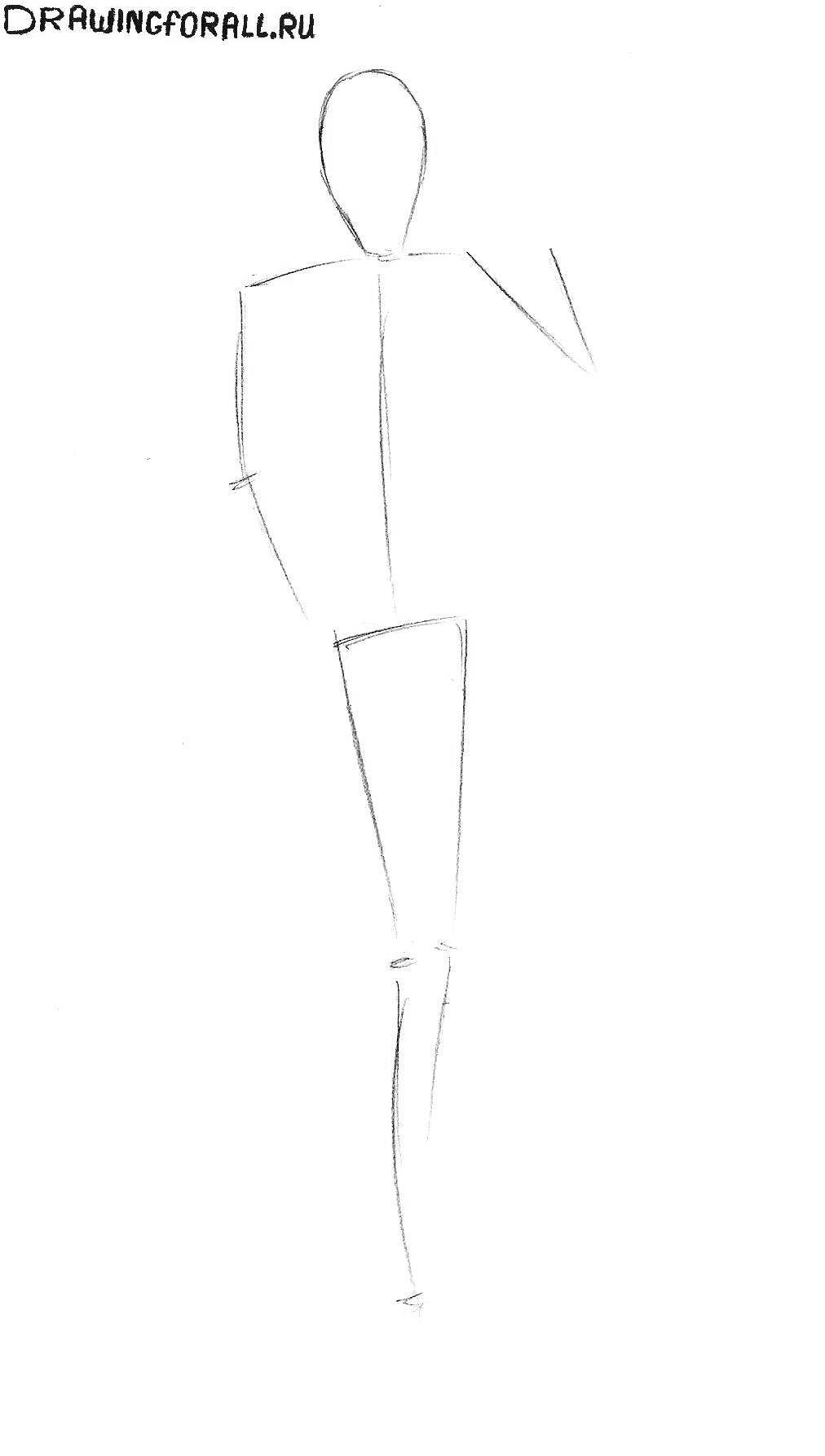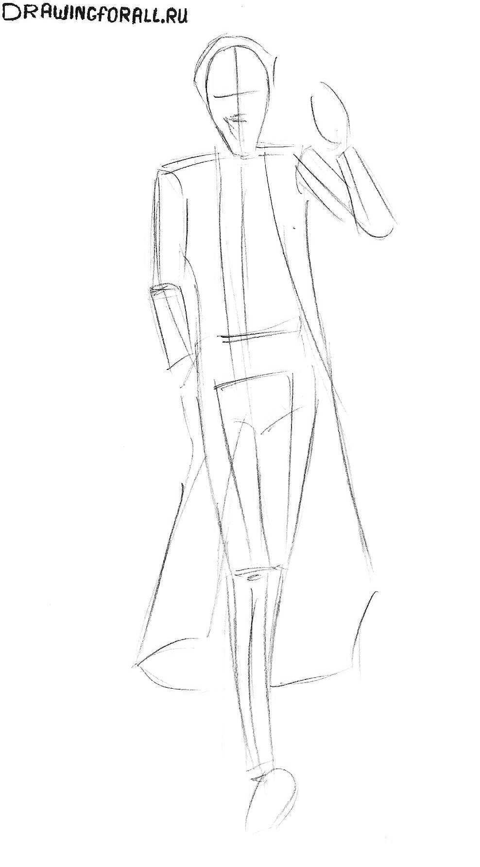 Все действия здесь очень похожи на один из этапов урока по рисованию Слендермена (да и во внешности этих двух героев есть что-то схожее), разве что Слендермен был одет только в строгий костюм, а наш Джокер носит плащ с длинным полами поверх костюма. Кстати, ориентируйтесь на ноги, когда будете рисовать края плаща, чтобы не ошибиться с его размером.