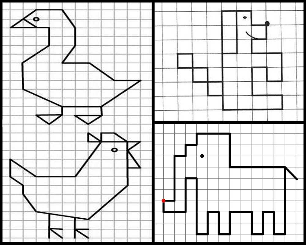 Пример простых и сложных рисунков, нарисованных по тетрадным клеточкам: