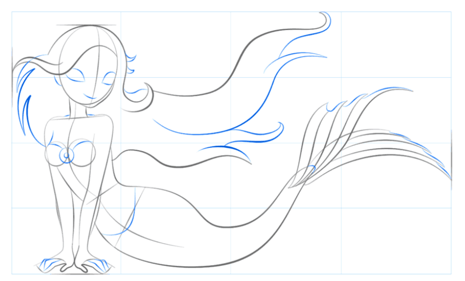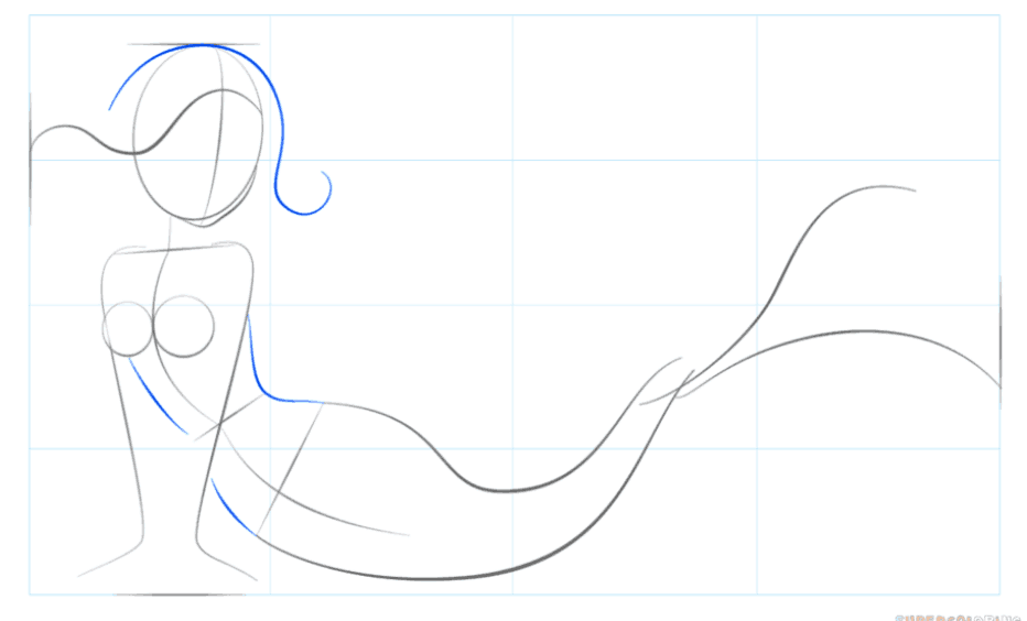 - Рисуем главное достоинство русалки — хвост. Аккуратно обводим овальную основу, идем дальше по вспомогательной линии, заужаем хвост, красиво загибая его в конце