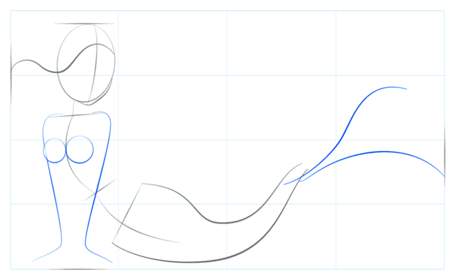 Нарисуйте гайдлайны для ласт, рук и кистей. Добавьте два круга для обозначения груди русалки.