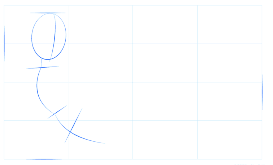 - Голову делим линиями на 4 части, остальные овальные фигуры — пополам