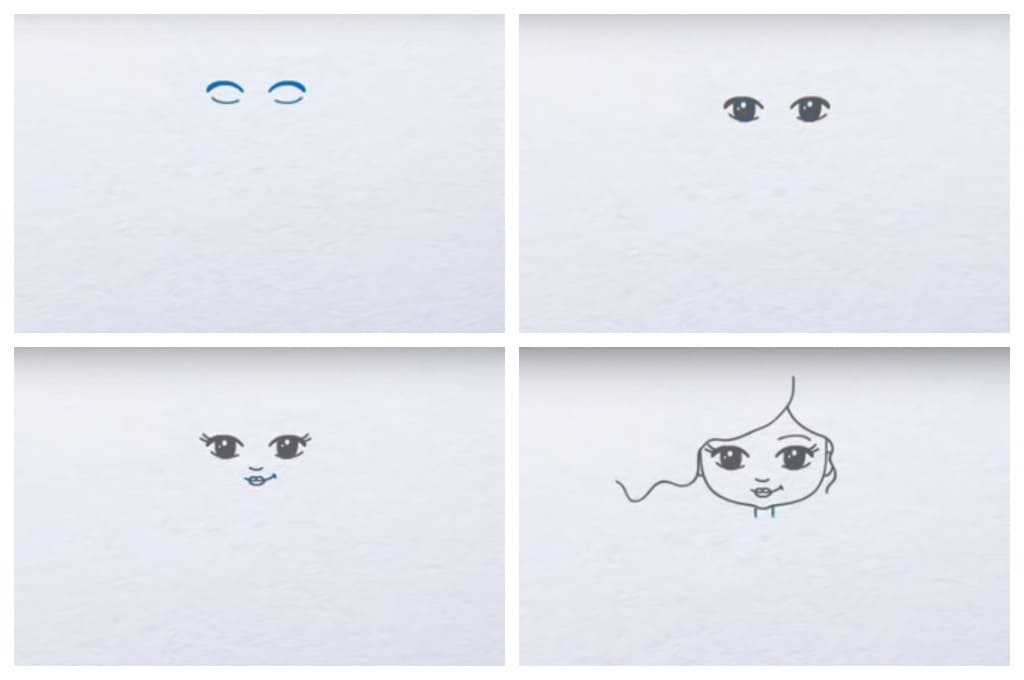 Глаза должны располагаться прямо над горизонтальной линией в круге головы, которая была нарисована на первом этапе. Глаза должны быть достаточно крупными и походить на треугольники, вершины которых смотрят влево. Основание каждого должно быть выпуклым наружу. Нижней боковой стороной треугольника должна служить горизонталь в круге. Нос русалочки представляет собой линию, которая начинается чуть выше правого глаза и напоминает растянутую букву S. Слева от этой линии небольшим штрихом намечают второе крыло носа. Губы рисуют в форме повернутой вправо буквы D. Круг головы служит границей, по которой плавными изгибами располагают волосы. Они могут быть направлены в любую сторону, спадать на глаза и плечи