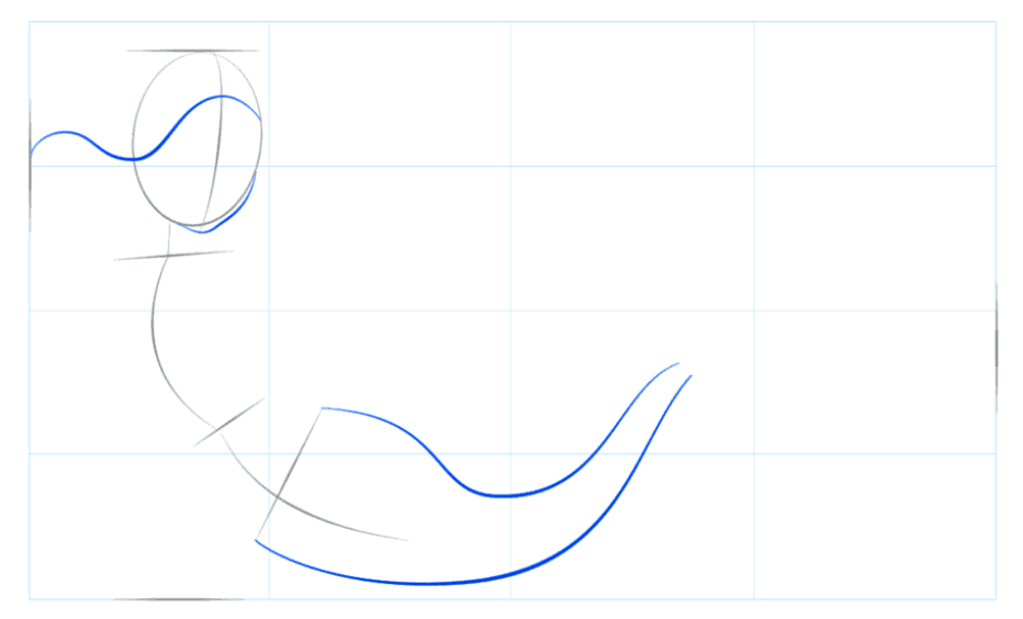 - Центральную вспомогательную линию продлеваем с изгибом, для формирования хвоста
