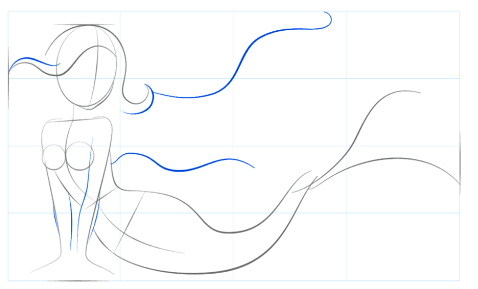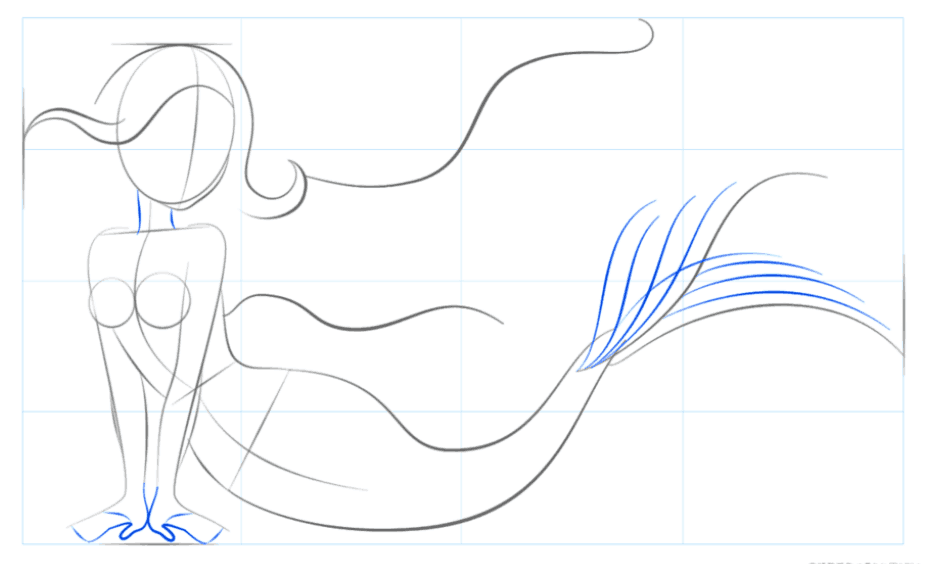 - Волосы у русалки будут длинными. Они должны развиваться в воде. Прорисуйте волнистые пряди. Добавьте плавники к хвосту. Их концы можно оформить зигзагами.