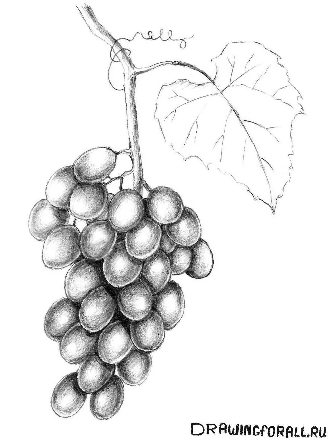 Виноград (рисунок для детей можно изобразить просто, прорисовывая мелкие детали в общих набросках) начинают рисовать с чернового наброска и постепенно переходят к прорисовке точных деталей.