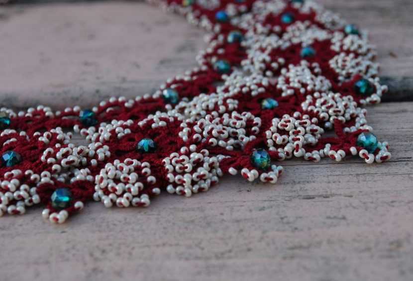 Освоив только три основных элемента, вы вполне в состоянии уже выполнить нечто особенное. Техника фриволите крючком и иглой для начинающих подразумевает создание простых украшений: вязаных кулонов, чокеров, а также воротничков, салфеток, скатертей. А когда у вас начнут получаться ровные и красивые колечки, вы можете дополнить плетение бусинками и стразами для создания настоящих шедевров.